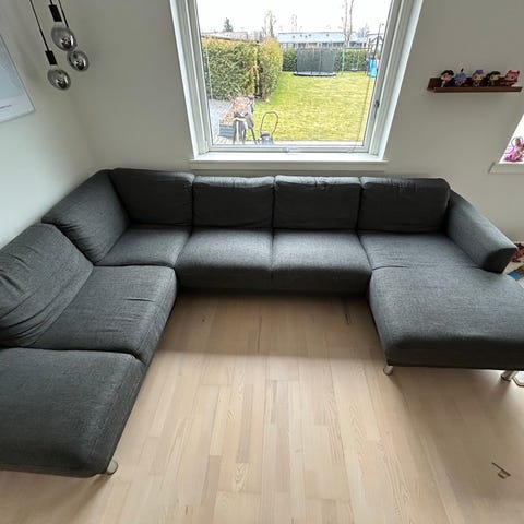 Grå/blå med uldbetræk. Kan adskilles i 3 dele. Købt i Ilva Helsingør for ca. 5 år siden, men er lidt for stor i vores nye stue