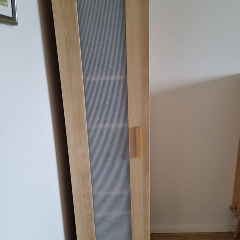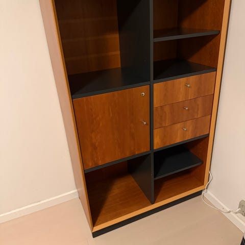 Fin og rummelig reol med 3 skabe og 2 vitrineskabe med lys