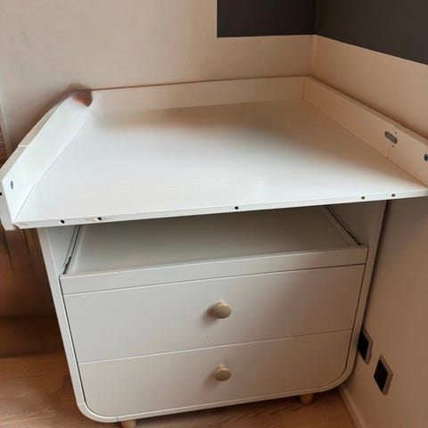 Alle skuffer og skab fungerer, men øverste skuffe kunne godt bruge lidt trælim.