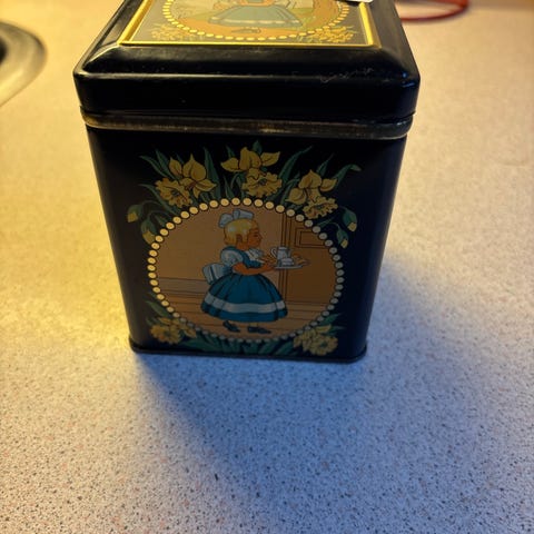 Gl flotte Irma køkkenbeholdere sæt i metal. Sættet består af tre beholdere med låg, mærket til ris, mel og gryn. Beholderne er udført i blå nuancer med gule blomstermotiver og figurmotiv på bagsiden. Indersiden er i metal, og lågene har lille knop for let åbning. Velegnet til opbevaring af tørvarer i køkkenet.