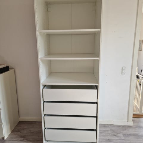 IKEA PAX garderobeskab i hvid. Skabet har bøjlestang øverst til ophæng af tøj, to åbne hylder i midten samt to skuffer nederst til opbevaring. Velegnet til soveværelse, entré eller walk-in-closet til opbevaring af tøj og tilbehør.