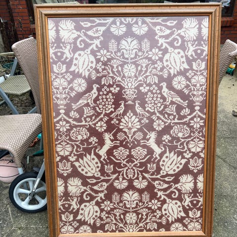 Disse er ægte håndværk fra en næsten uddød tradition (sønderjysk/jysk stil), ikke maskinvævet masseproduktion. Perfekt som retro-vægdekoration, til hyggelig stue, sommerhus eller samling af dansk kunsthåndværk.