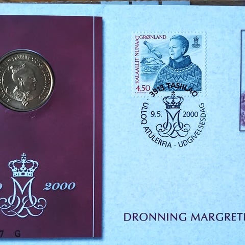 20 KR KRONE 1997 UNC. Margrethe II 25 År Møntbrev med Grønlands Frimærke AFA 303