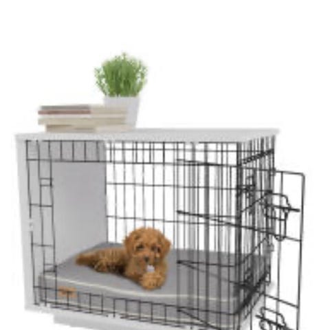 Omlet hundebur sælges som er sammensat med et skab. Meget praktisk og flot at have i stuen. Plast bakke i bunden.