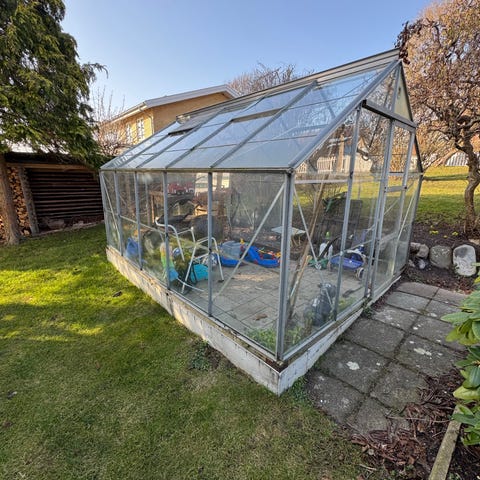 Drivhus med glasvægge og glastag samt metalstel. Velegnet til dyrkning af planter, grøntsager og krydderurter i haven. Konstruktionen giver læ og beskyttelse, samtidig med at glasset sikrer godt lysindfald til planterne. Egnet til placering på græsplæne eller fast underlag afhængigt af behov. Nogle glas skal skiftes.