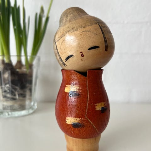 Japanske vintage kokeshi sælges. De er fra Showa-perioden i Japan med flot patina og håndlavede motiver.