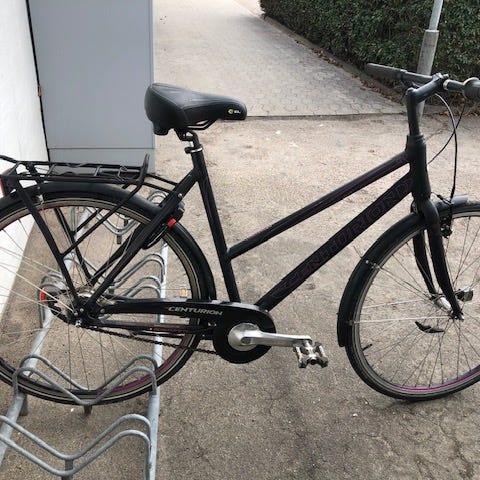 Centurion damecykel med 52 cm stelstørrelse. Cyklen har lav indstigning og er egnet til kvinder. Stellet er i en gul farve med sort sadel og sorte håndtag. Udstyret omfatter fladt styr, fælgbremser for og bag, indvendigt gear samt bagagebærer. Velegnet til hverdagskørsel og pendling i byen.