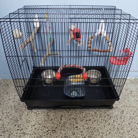 Fuglebur med rektangulær plastbund og metalgitter med tilbehør.