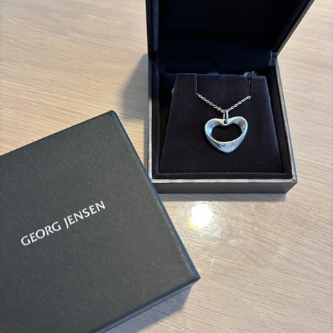 Georg Jensen sølv halskæde til kvinde. Halskæden er udført i sølv med et vedhæng i et aflangt, åbent design. Kæden har klassisk kædelås og bærer Georg Jensen stempel. Leveres i æske fra Georg Jensen, som vist på billederne.