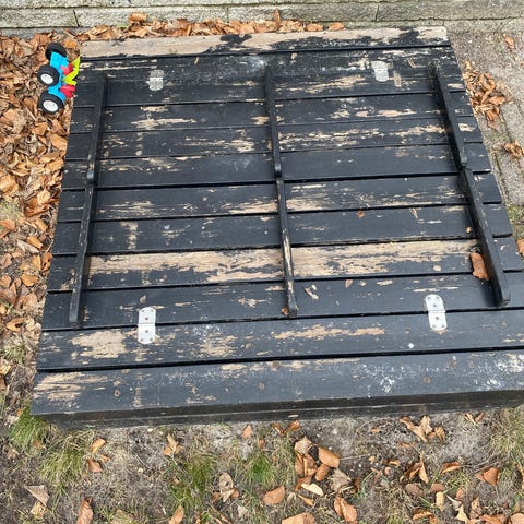 Sandkasse, 6 kantet med låg kan afhentes sammen med diverse plastic legetøj.