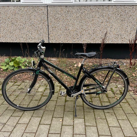 Cyklen har lygter, cykelkurv og lås (har nøglen).