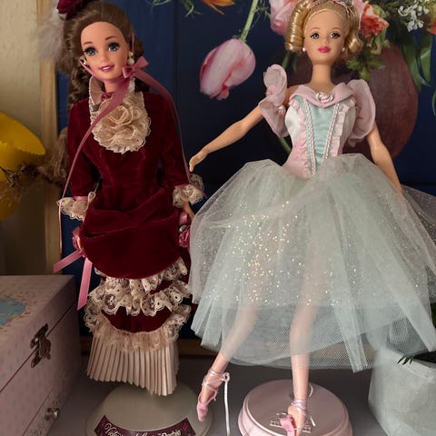 Barbie dukker blandet sæt med fire dukker i forskellige outfits. Sættet omfatter blandt andet en dukke i gul dragt, en dukke i pink T-shirt og blå bukser, en dukke i hvid brudekjole samt en dukke i rød top og mønstret nederdel. Velegnet til leg og samling for børn, der kan kombinere dukkerne med andet Barbie-tilbehør og -møbler.