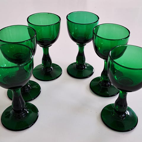 Kastrup glasværk 1938, Lis glasserie blomst slibning med sort fod. Sæt med 6 glas med druegravering og sort fod. De to af dem har et mælkehvidt skær efter opvaskemaskine. Alle glas er intakte.
