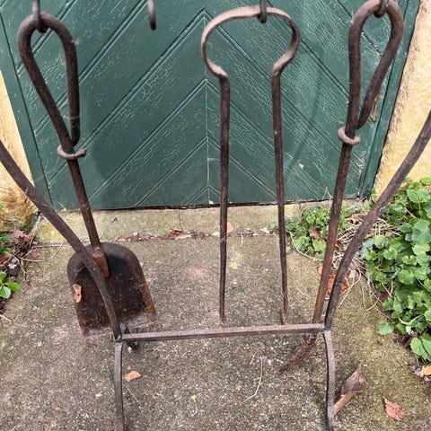 Pejsesæt i metal i sølvfarvet look. Sættet består af flere redskaber til brug ved pejs eller brændeovn, herunder skovl med dekoreret blad samt lang ildrager og tang. Fint sæt af ældre dato. Noget brugt, deraf prisen.