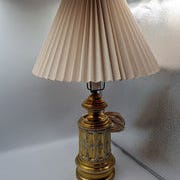 Bordlampe i messing med grøn glasskærm. Lampen har en rund fod, justerbar arm og dekorativt cylinderformet element på siden. Skærmen er i mørkegrønt glas med klassisk form. Lampen er elektrisk og har ledning til tilslutning i stikkontakt. Velegnet som skrivebordslampe eller stemningsbelysning på bord eller skænk.