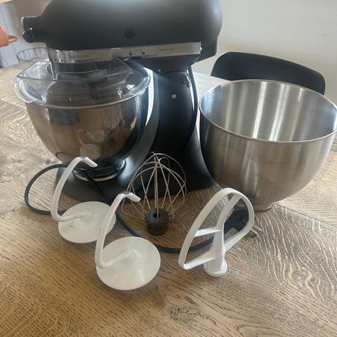 KitchenAid køkkenmaskine i cremefarve med stor skål i rustfrit stål. Maskinen leveres med piskeris, dejkrog og fladpisker, som egner sig til æltning af dej, piskning og røring af forskellige ingredienser. Velegnet til almindelige bage- og madlavningsopgaver i køkkenet.
