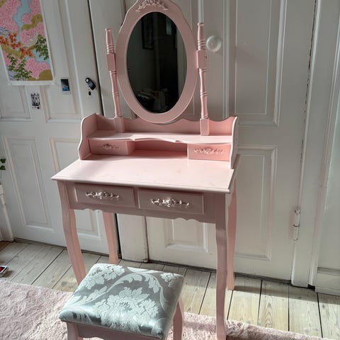 Sødt sminke/smykke bord med skuffer, vippe spejl og blød puf.