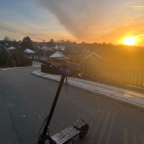 Elektrisk løbehjul . Løbehjulet har styr med håndtag og integreret display til visning af kørselsinformation. Der er fast fodplade med skridsikkert underlag. For- og baghjul er udstyret med dæk, og bagpå ses integreret baglygte. Egnet til transport på kortere strækninger på fast underlag.