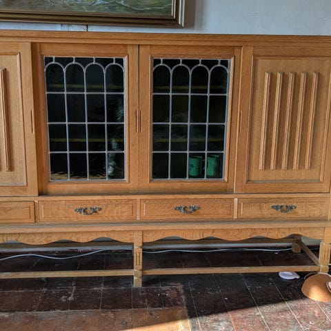 Reol med glas låger og tre skuffer. Reolen har nogle skader (se billeder). Reolen er købt på Lauritz for noget tid siden.