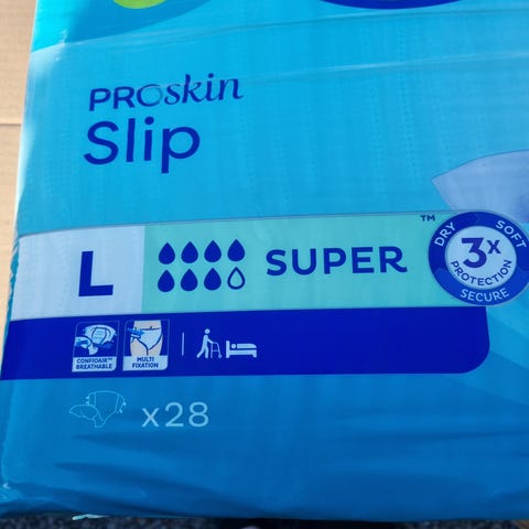 Tena ProSkin Slip bleer i størrelse L, Plus-absorption. Engangsbleer med tapelukning til voksne. Pakken indeholder 30 stk.