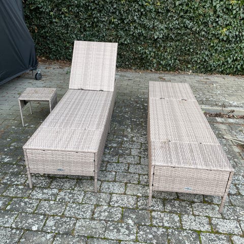 2 solstole på hjul, 6 havestole fra Rovergarden og 2 sideborde fra Grosfillex