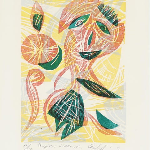 Signeret Carl-Henning Pedersen, Paris 1989, 13/100, "Triumfbuen og Pigen. Træsnit. Bladstørrelse 34,5 x 26 cm. Indrammet i sølvmalet træramme med målene 43 x 53,5