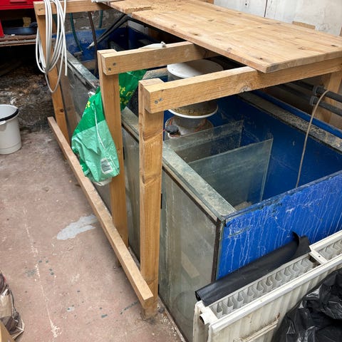 Specielt bygget akvarium 178 cm langt, 40 cm bredt og 45 cm højt. Har stået ude i ca 2 år, så kan ikke garantere at det er tæt. Men kan f.eks. også bruges som terrarium