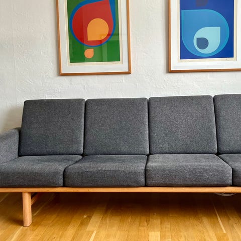 Møblerne er ikke restaureret, men i original og god stand. Trænger til nye meder/gjorder samt evt. til rensning af hynder pga. alder, men de er ikke snavsede og der er kun to små steder bag på en hynde med slid.
