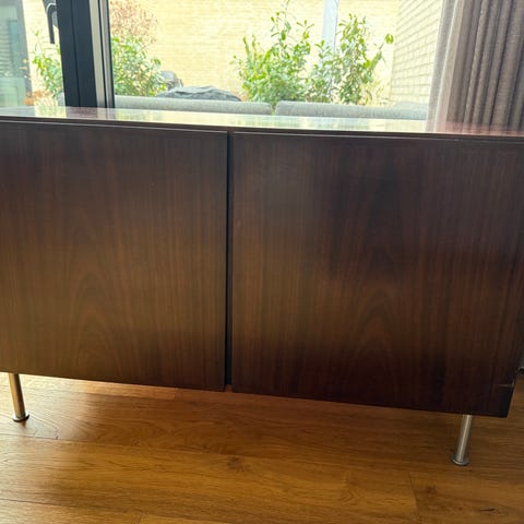 Skænk i træ med udskårne detaljer og glaslåger. Møblet har flere låger, heraf to med glasfelter, samt skuffer øverst med messingfarvede greb/beslag. Indvendigt er der hylder til opbevaring. Klassisk, massivt træmøbel egnet til opbevaring i stue, spisestue eller entré. Møblet stod sammen med et højt vitrineskab (også til salg) i Hjerk Præstegård, da min far i 1955 flyttede ind der. Møblet har holdt til at stå uden opvarmning i en del år, indtil jeg fik det og fik det renoveret. Hvis det sælges sammen med vitrineskabet, så gives der rabat.