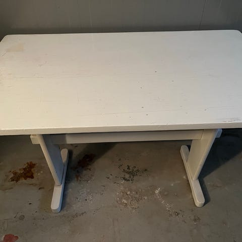 Den har 1 stor skuffe. Den trænger til en pudsning. Venstre bagben sidder løs og skal evt limes.