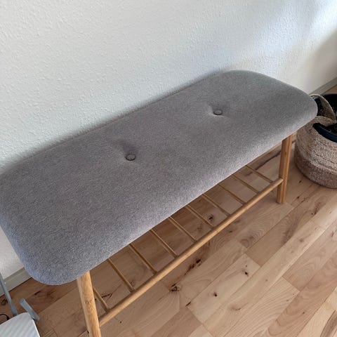 Jysk bænk med polstret sæde og integreret skohylde i træ. Sædet er betrukket med gråt stof og har to knapper som detalje. Under sædet er der en træhylde med tremmer, der kan bruges til opbevaring af sko eller andre mindre genstande. Bænken egner sig til entre, gang eller soveværelse som siddeplads og opbevaringsløsning.