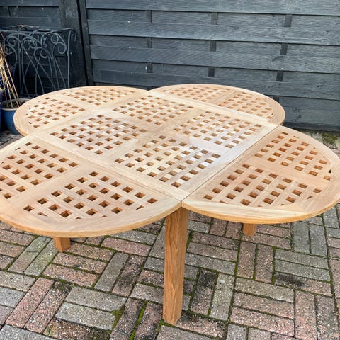 Trip Trap havebord og stole sæt i teaktræ. Sættet består af et aflangt bord med lamelbordplade og tilhørende stole i massivt træ. Teaktræet har en vejrpatineret overflade, som kan beholdes eller slibes og olieres efter behov. Egnet til udendørs brug på terrasse eller i have. Bord og stole er udført i klassisk Trip Trap design med fokus på funktionel udendørs indretning.