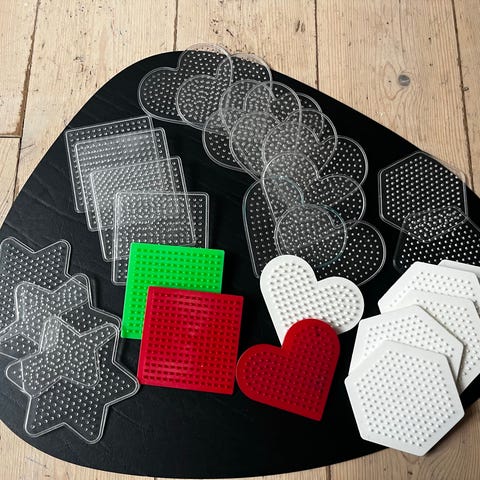 Hama perleplader sæt i forskellige former. Sættet indeholder flere perleplader i klare og lyse materialer, blandt andet runde, sekskantede, hjerteformede og stjerneformede plader. Egnet til brug med Hama perler til kreative perlemotiver og hobbyprojekter for børn og voksne.