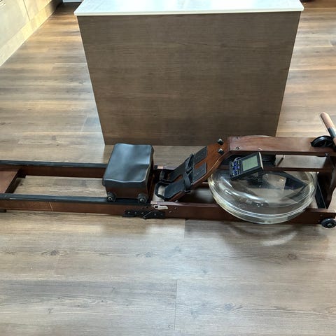 Toorx RWX Air Cross romaskine i sort. Romaskinen har et langt glideskinne-design med sæde på skinne, fodstøtter og håndtag for rotræning. Foran er der luftmodstandsenhed samt træningscomputer med display, der kan vise relevante træningsdata som tid, distance og tempo. Velegnet til indendørs konditions- og styrketræning af hele kroppen. Nypris ca. 10000 kr.