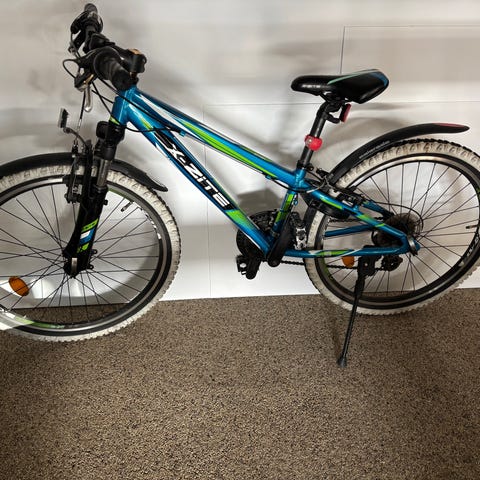 X-Zite børnecykel med 24" hjul i sort. Cyklen har klassisk herre-/unisexstel med lige overrør, udstyret med skærme for og bag samt bagagebærer. Der er støtteben, pedaler med reflekser og reflekser i hjulene. Egnet som hverdagscykel til børn i alderen, der passer til 24" hjul, fx til skolekørsel og fritidsbrug.