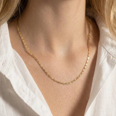 Guld Halskæde i 14 karatEstimeret nypris: 7000,00 kr\nModel: Mariner Link\nVægt: 3 gram\nLængde: 60 cm\nBredde: 2.3 mm\nStand: Som ses på billeder, god stand med almindelige brugsspor og slidtageHos anotherslegacy.dk får du:\n✓ Gratis fragt på alle produkter\n✓ Pakken sendes inden for 1-2 dage\n✓ Din pakke er forsikret under transport\n✓ 14 dages guld bytte- og returretHos anotherslegacy har vi høje standarder, til de produkter vi sælger:\n• Alle produkter er blevet ultralydsrenset\n• Alle produkter er gennemgået for fejl og mangler\n• Alle produkter har fået en lødighedstest i røntgen maskine. Vi sælger IKKE forgyldte genstande\nBook en fremvisning i dag.Butik:\nH. C. Andersens Blvd. 38 st. tv., 1553 København V\nMandag-Fredag 09:00-17:00\nGG190515