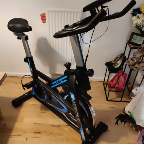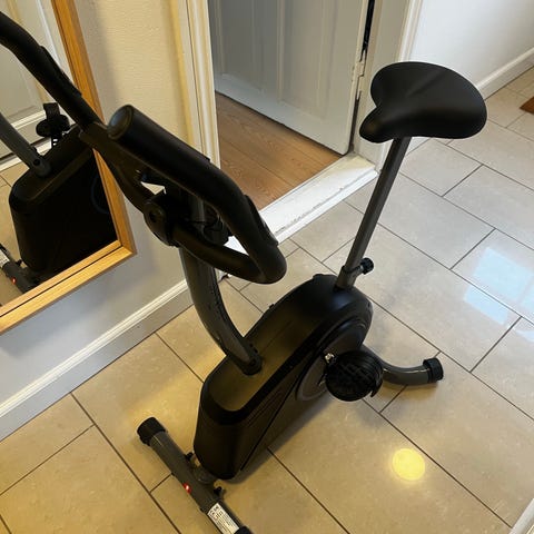 Virtu Pro 16 motionscykel i hvid og rød. Cyklen har indkapslet svinghjul og kædetræk, justerbart sæde og styr samt racerstyr med integrerede knapper til betjening. Egnet til indendørs cykeltræning og spinning. Dell touchskærm medfølger. Cyklen står på en træningsmåtte, som kan beskytte gulvet under brug. Nypris over 40000.-