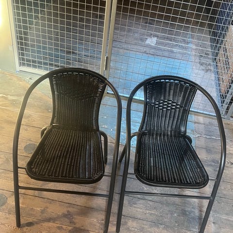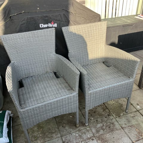 Sæt med to havestole i flettet materiale i naturfarve. Stolene har armlæn og høj ryg samt små fødder i bunden. Velegnet til altan, terrasse eller have som siddepladser ved bord eller som loungestole.