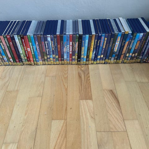 Disney DVD samling med forskellige tegnefilm og familiefilm. Samlingen omfatter flere klassiske og nyere Disney titler i standard DVD-format. Filmene er i originale plastcovers med trykte omslag. Velegnet til afspilning på DVD-afspiller, computer med DVD-drev eller anden kompatibel enhed. Antallet af DVD’er og specifikke titler fremgår af billederne. I alt 87 DVD sælges samlet.