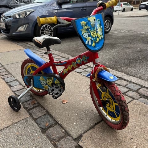 Paw Patrol børnecykel med 12" hjul i rød og blå. kædeskærm med Paw Patrol-motiver, farvede fælge og dæk samt saddel med motiv. Der er monteret skubbestang bagpå, så en voksen kan hjælpe med at styre og skubbe cyklen. Velegnet som begynder- og læringscykel til mindre børn, der skal øve balance og cykling på korte ture.