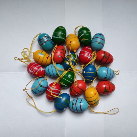 Fin samling påskeæg af bemalet træ. Klassisk røde og gule med mønstre.
