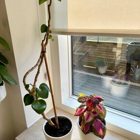 Stueplante i potte med store grønne blade. Planten står i en rund potte og er egnet som indendørs pynteplante. Velegnet til placering ved vindue eller i et lyst hjørne af rummet.