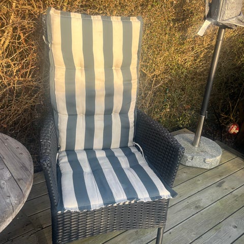 Sæt med to havestole i recliner-model. Stolene er udført i grå kunstflet med højt ryglæn og brede armlæn. Sæde- og ryghynder er i sort stof. Egnet til udendørs brug på terrasse eller altan. Stolene har justerbar ryglænsmekanisme, så man kan sidde oprejst eller mere tilbagelænet.