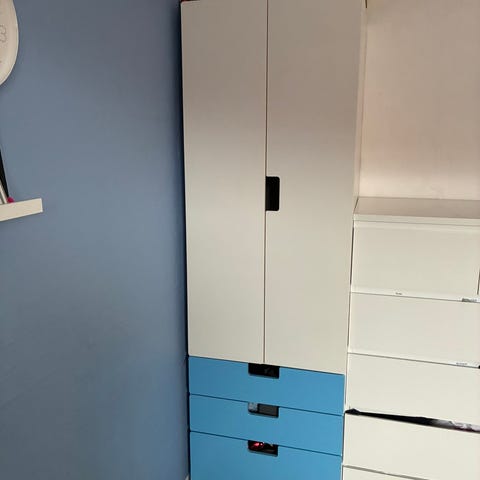 Sælger min datters garderobeskab fra Ikea. Serien hedder Småstad/Plasta. Det fejler intet, ingen ridser og alt fungere som det skal. Fremstår rigtig flot. Kommer fra røgfrit og dyrefrit hjem. Er et par år gammel.