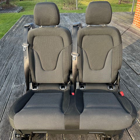 Bilforsæde i sort stof med integreret nakkestøtte og sikkerhedssele. Sædet har justerbar ryglænsmekanisme og monteringsbeslag i bunden til fastgørelse i bilen. Velegnet som erstatningssæde eller ekstra sæde, hvor der er behov for et komplet forsæde med nakkestøtte og sele.