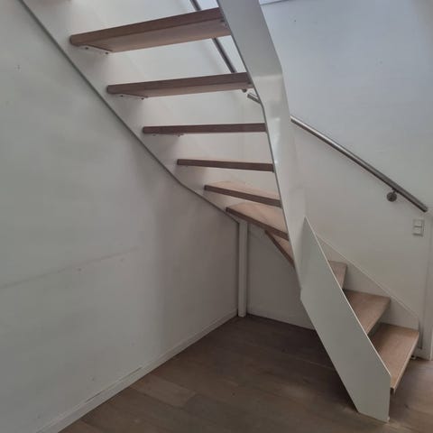 Trappe med trætrin opbygget på metalramme. Højden er 75 cm og 130 cm bred