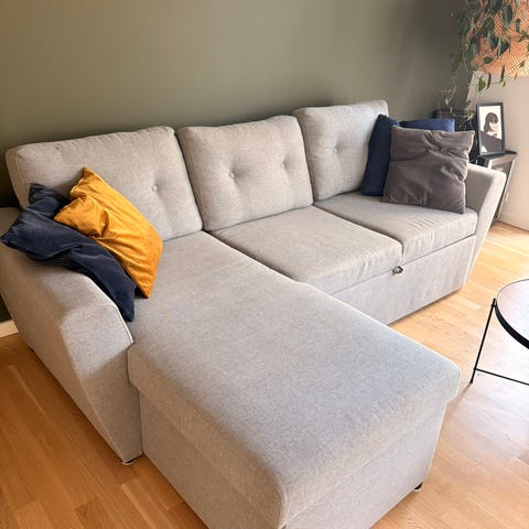 Grå sovesofa med chaiselong. Sovemål 140x200.