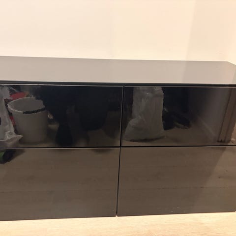 Væghængt BESTÅ kommode fra IKEA sælges. Der medfølger glasplade til. Lige nu står den på gulvet grundet flytning, men beslag til at hænge på væggen medfølger. Der er to små huller i siden af møblet (som vist på billedet), men ikke noget man ser når møblet hænger og deraf den billige pris.