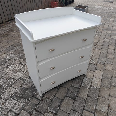 Babysam puslebord & kommode i én i hvid. Kommoden har integreret pusletop med høje kanter og flere skuffer til opbevaring af babyudstyr, tøj og tilbehør. Velegnet til brug på børneværelset eller i soveværelset som pusleplads og opbevaringsmøbel. Fremstår rigtig flot. Kommer fra et røgfrit og dyrefrit hjem.