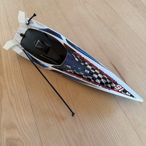 Mindre båd, du skal selv den færdig, så derfor er den også billig. (gls mulig) Det en vild motor(den ser helt ny ud) og escen (2-4 cells kan den klare). Så kik lige på den. Evt. byd !!